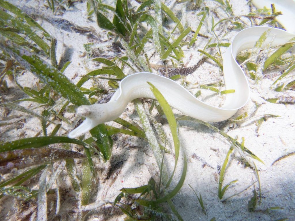 次に、ハナヒゲウツボ様な泳ぎ方をしているが、身体の色が真っ白、顔が全然違うのでなんだこいつは!と思ったらおそらくかなり激レアな「モヨウタケウツボ」が泳いでいる所に遭遇‼️