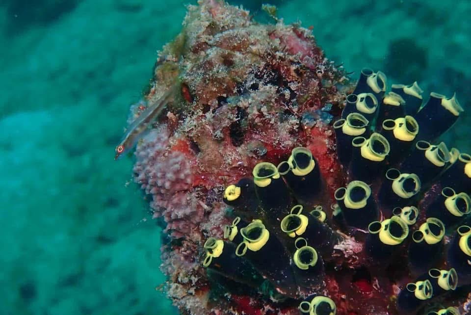 このホヤはマラパスクアでよく見るホヤ!左側にセボシウミタケハゼ🤭